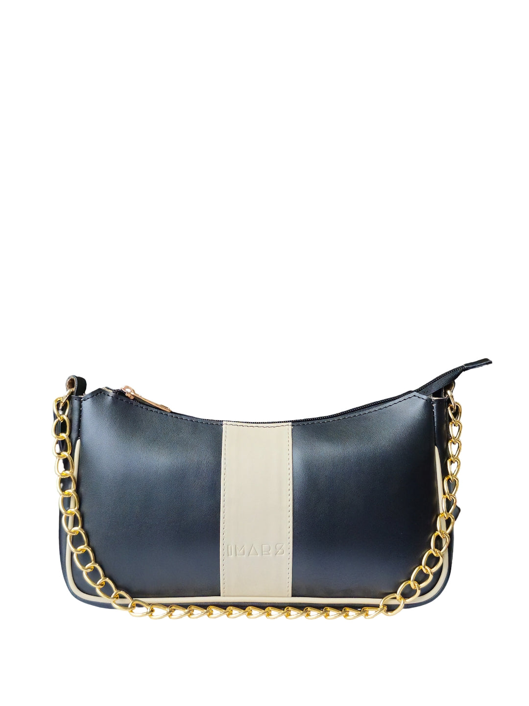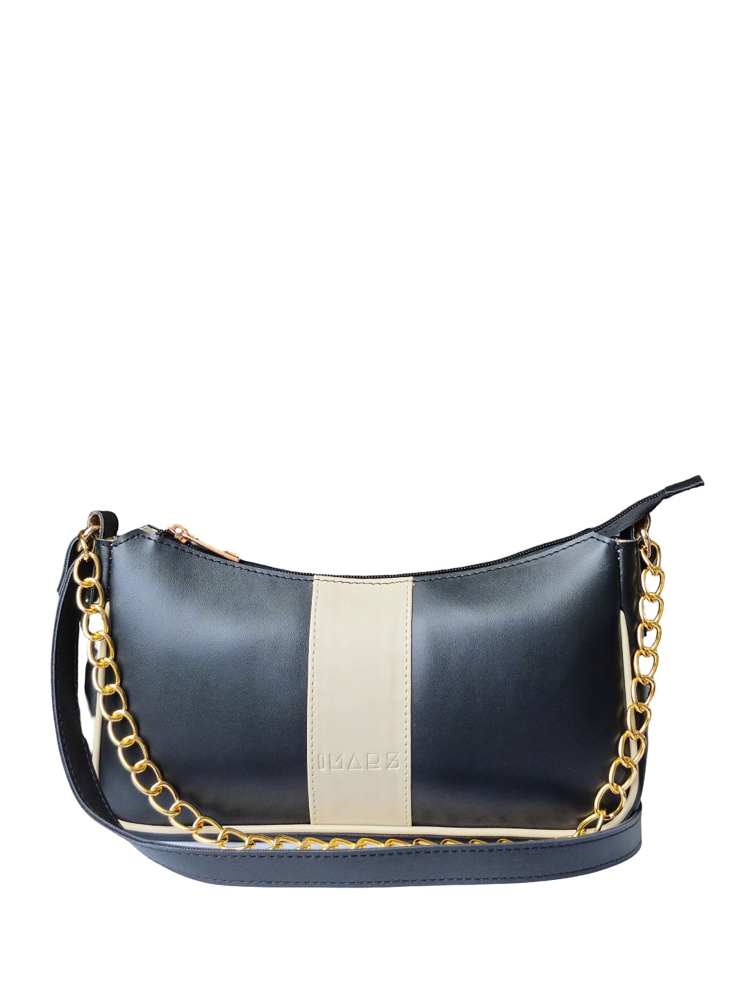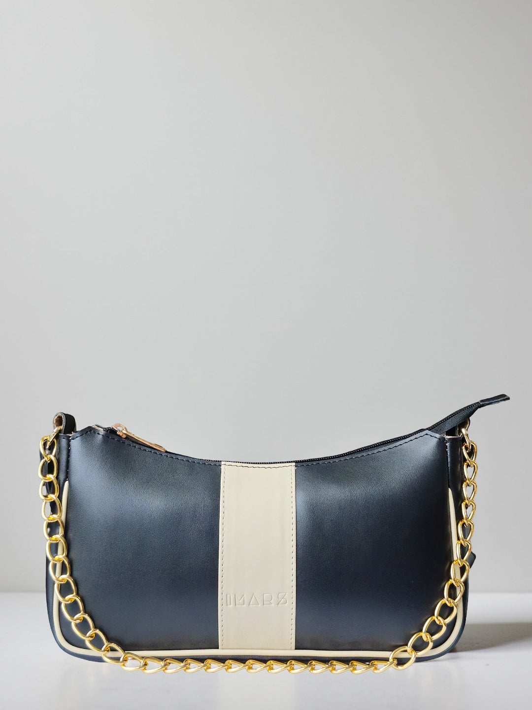 This chic shoulder bag comes in a sleek black finish, highlighted by a soft cream center stripe for a refined, minimalist look.
