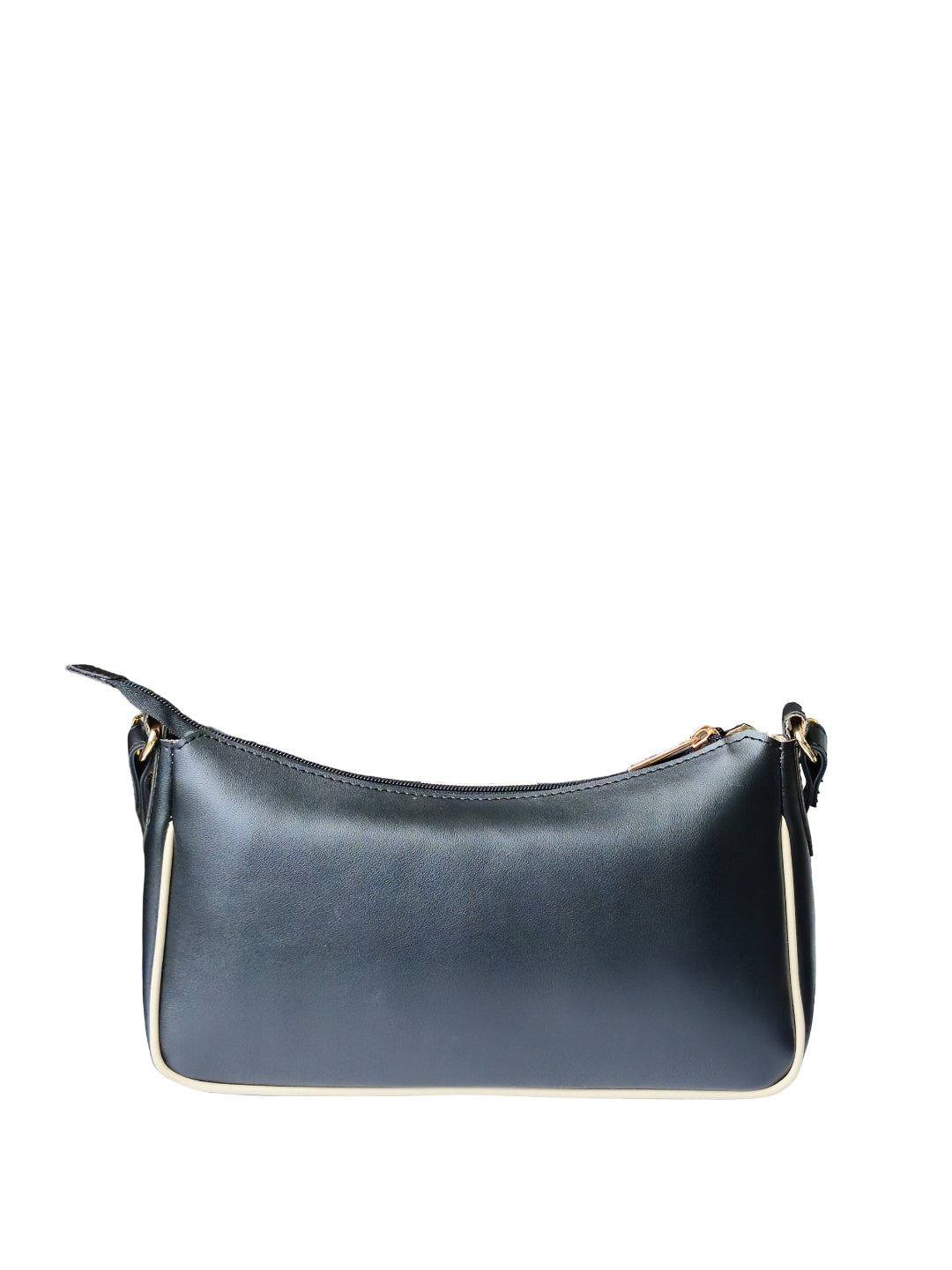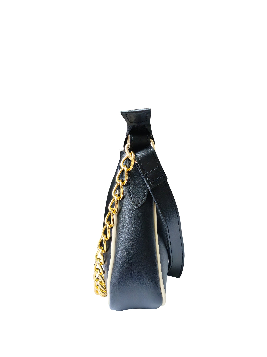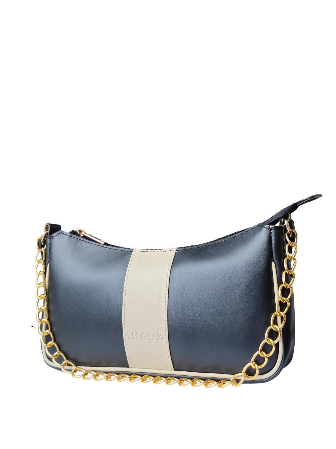 This chic shoulder bag comes in a sleek black finish, highlighted by a soft cream center stripe for a refined, minimalist look.