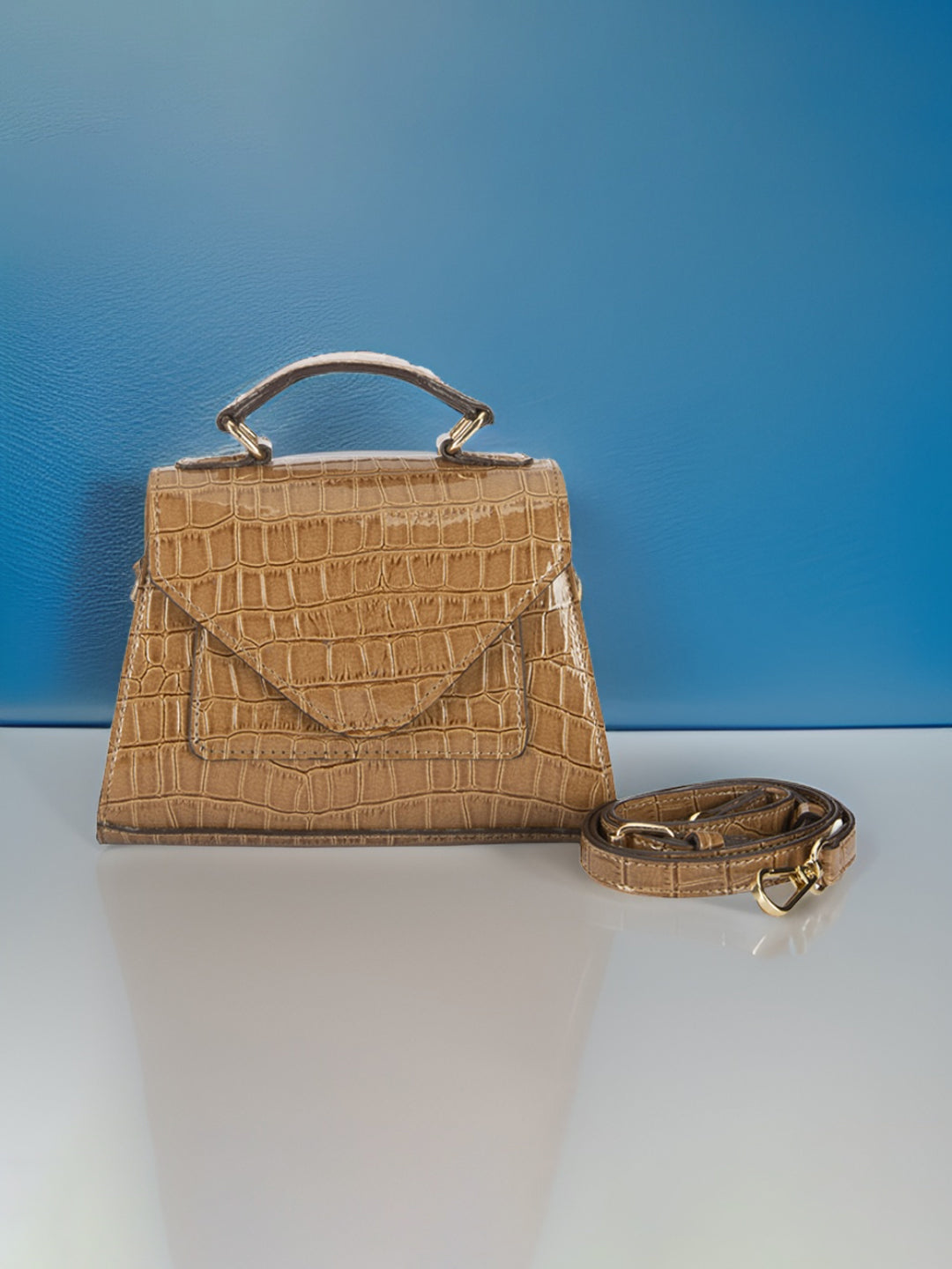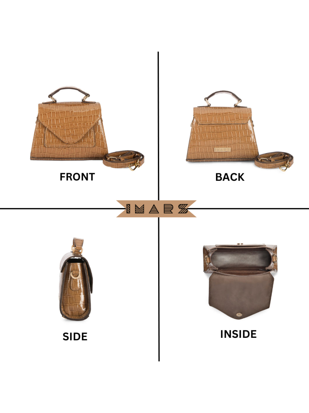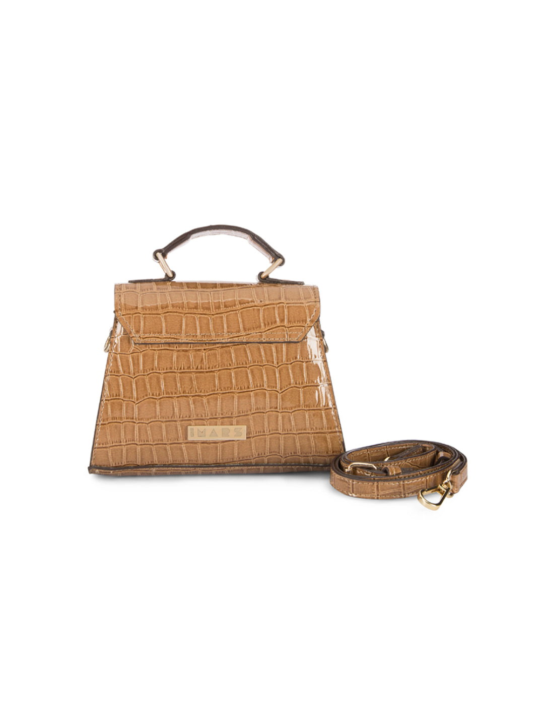 Introducing our Brown Croco Leatherette Small Structured Handbag, the perfect accessory for any occasion. Crafted from eco-friendly materials with reinforced stitching, this lightweight design features a detachable sling and an adjustable strap length for your convenience. The inner lining offers excellent durability and the magnet closure ensures security. With its water-resistant properties, you can trust this handbag to protect your belongings. Complete with a front pocket and available in additional colors, this handbag combines style and functionality effortlessly. With dimensions of 17.5*6.5*13 cm, it's compact yet spacious enough to hold all your essentials. Elevate your fashion game with this chic and versatile handbag today.