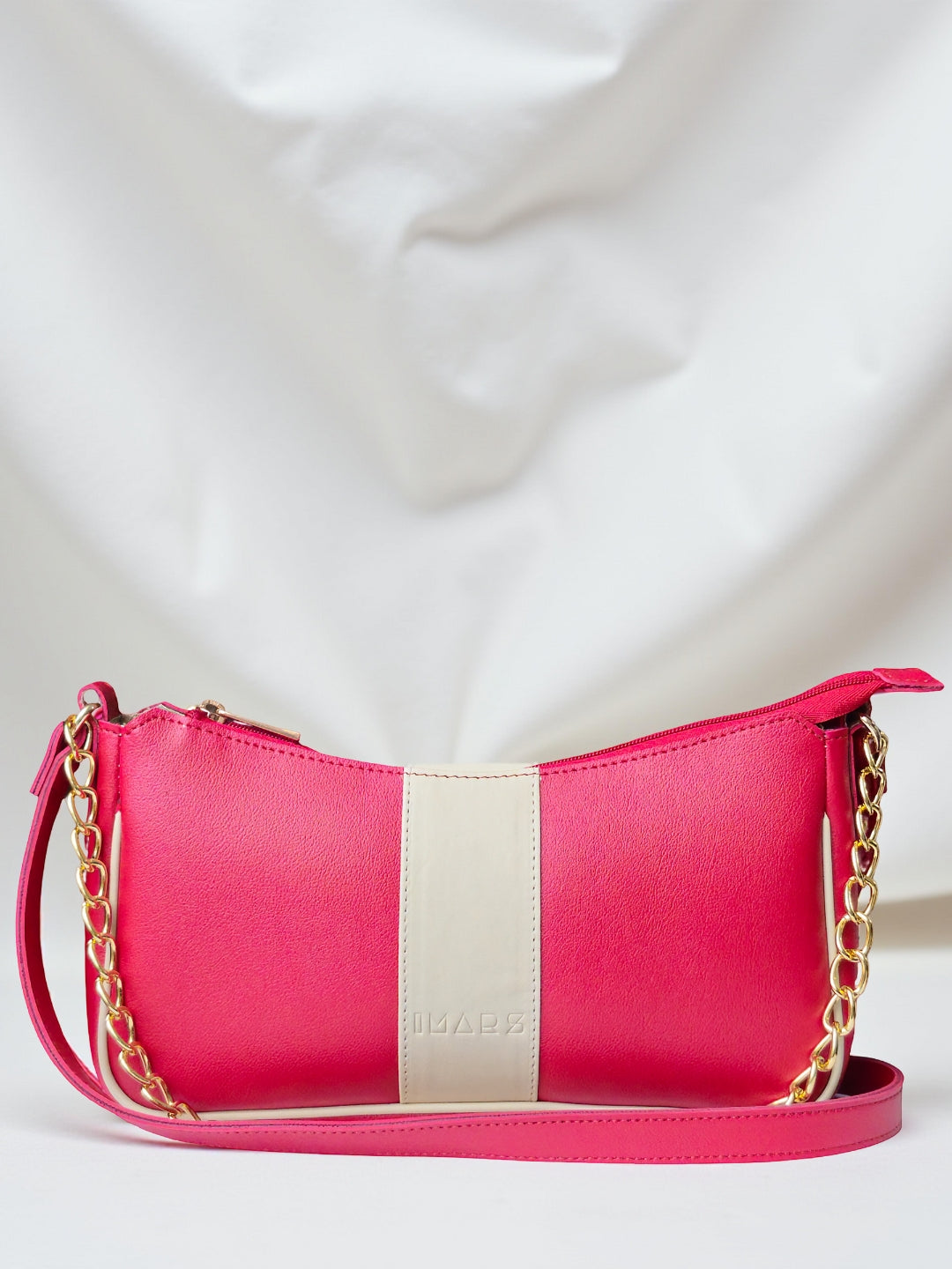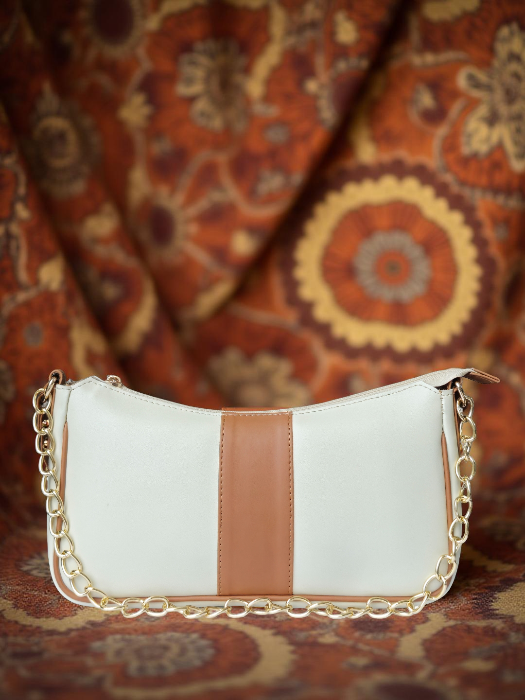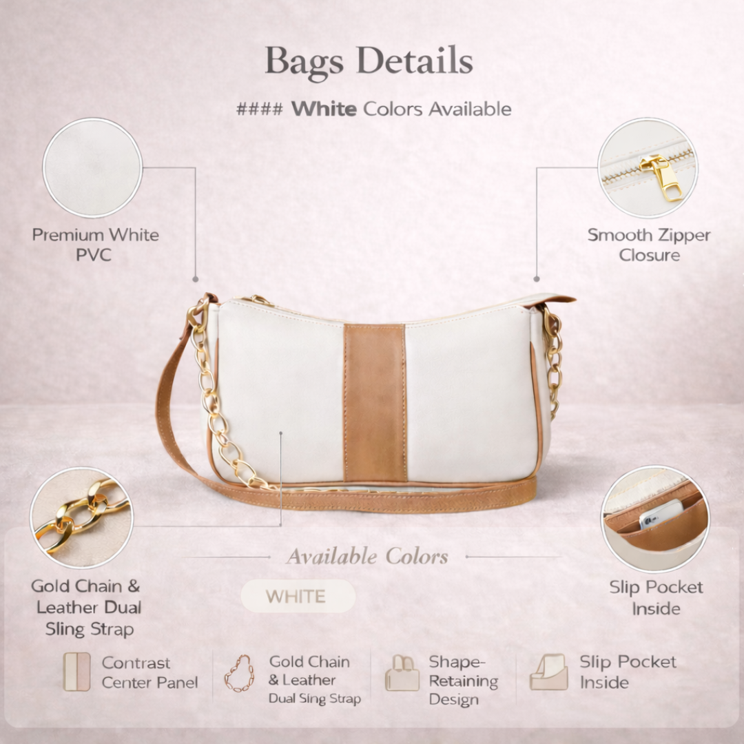 This refined shoulder bag in classic white offers a clean, timeless look with a soft contrasting center panel for subtle elegance. Finished with a gold-tone chain handle and sleek strap, it’s perfect for adding a polished touch to any outfit. this bag comfortably accommodates your daily essentials, including your phone, lipstick, keys, and airpods.