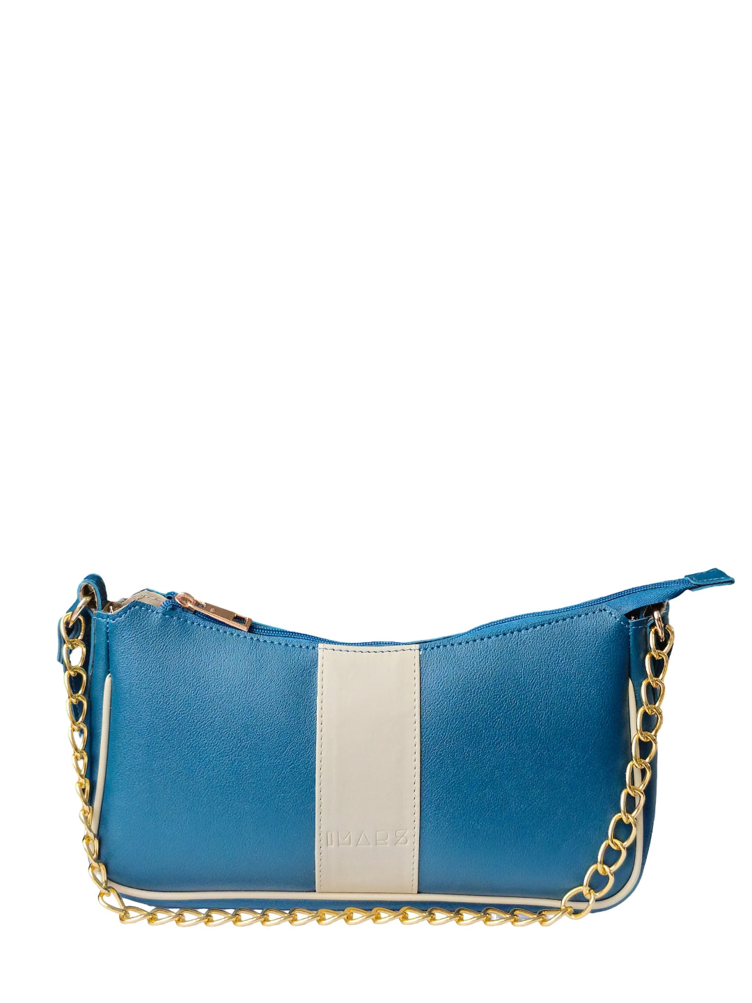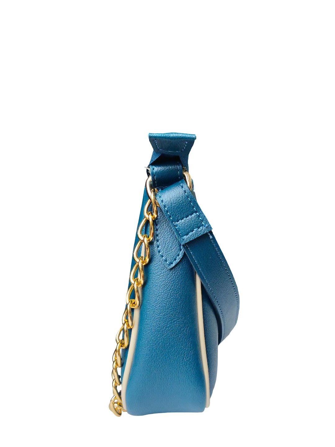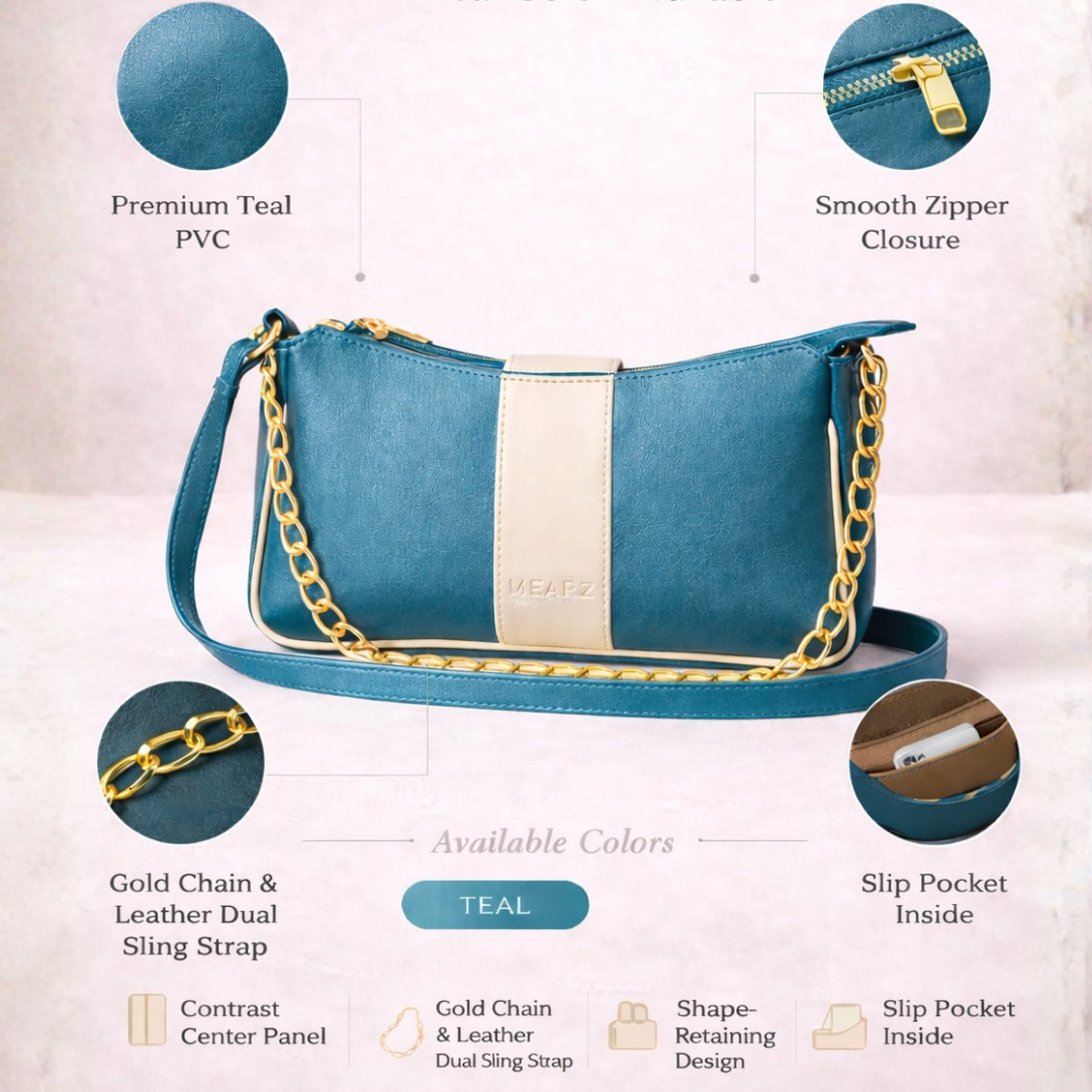 This elegant shoulder bag features a deep Teal finish paired with a subtle cream center panel for a fresh, sophisticated look. The gold chain handle and clean silhouette add a polished touch, making it ideal for everyday wear or special outings.. this bag comfortably accommodates your daily essentials, including your phone, lipstick, keys, and airpods.
