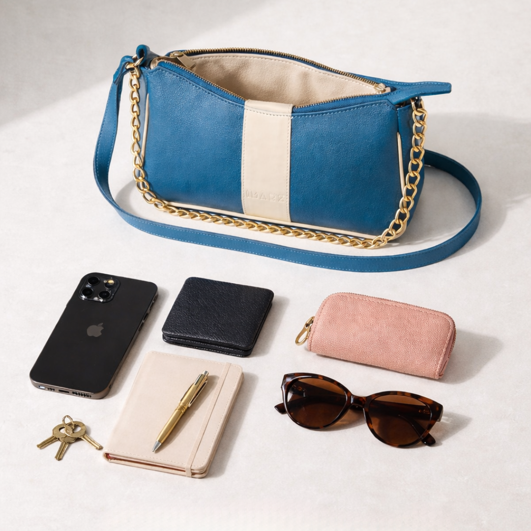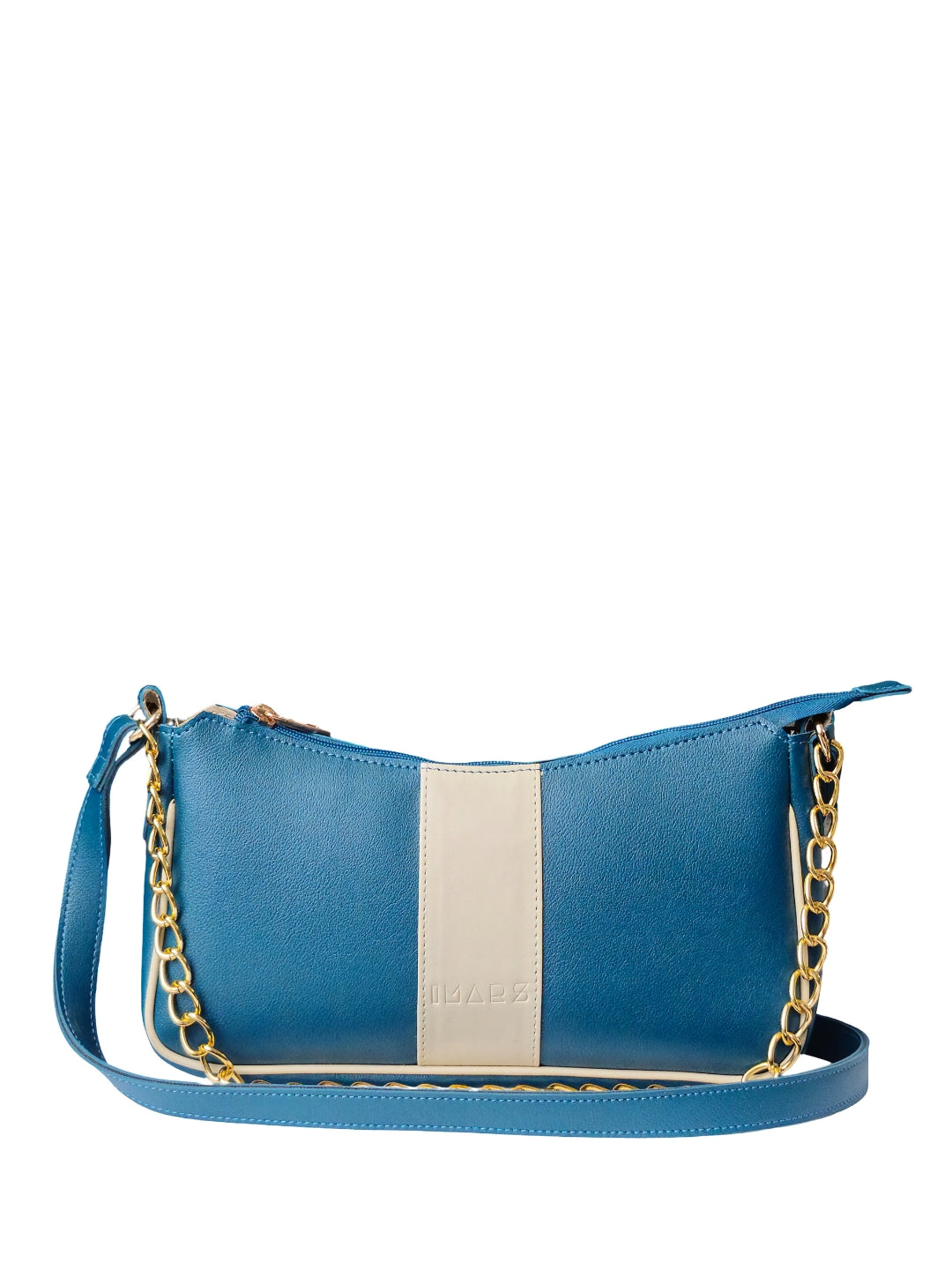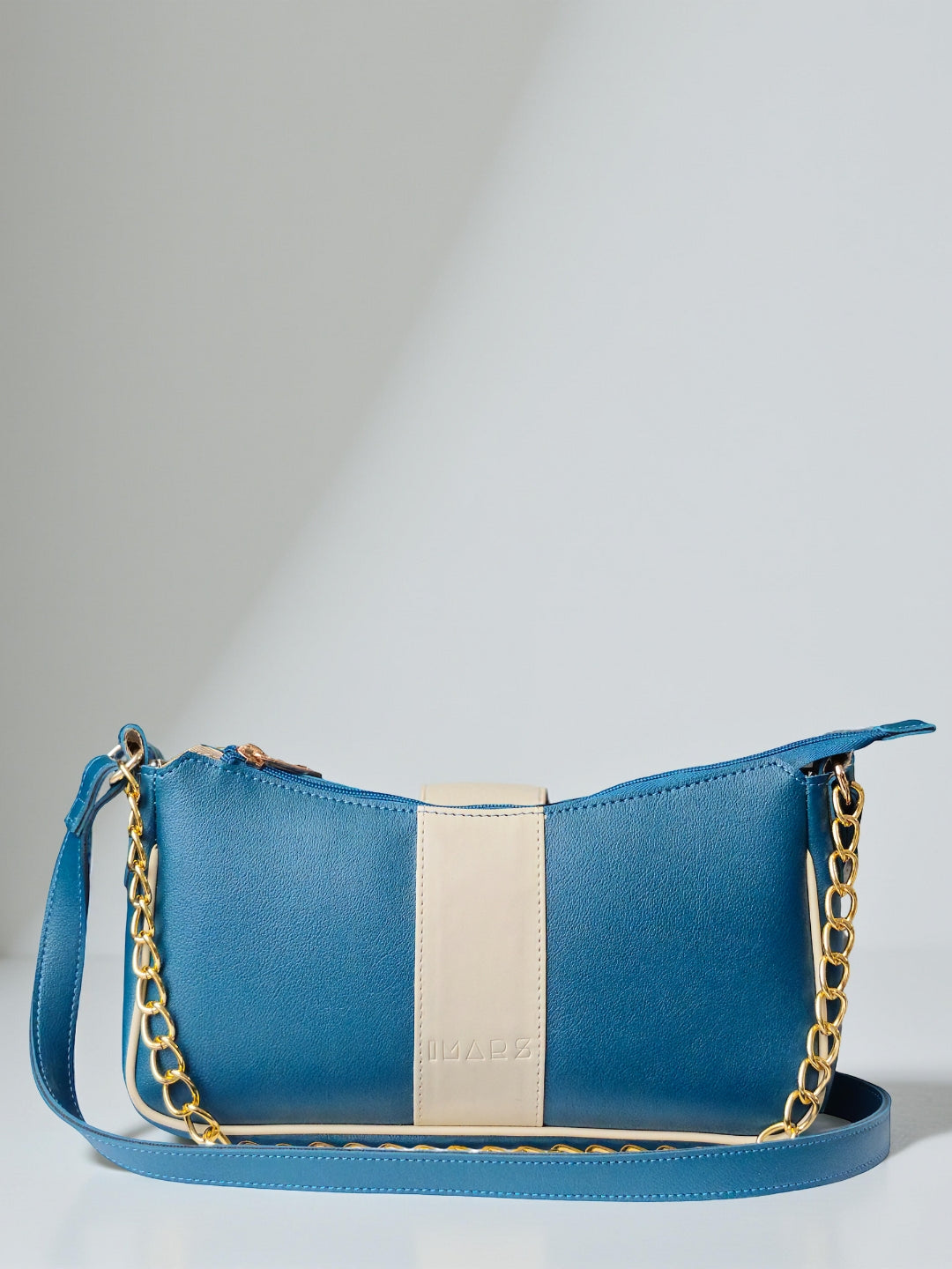 This elegant shoulder bag features a deep Teal finish paired with a subtle cream center panel for a fresh, sophisticated look. The gold chain handle and clean silhouette add a polished touch, making it ideal for everyday wear or special outings.. this bag comfortably accommodates your daily essentials, including your phone, lipstick, keys, and airpods.