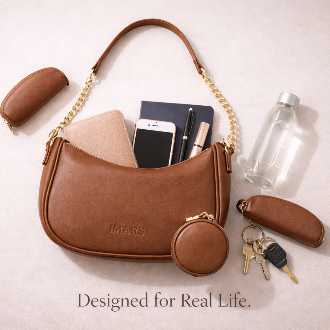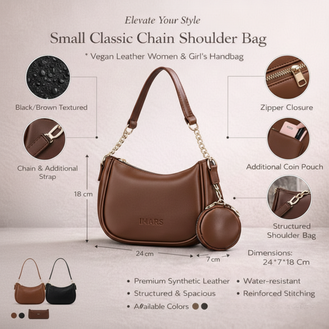 Upgrade your everyday style with the IMARS Brown Textured Shoulder Bag. Made from high-quality, eco-friendly synthetic leather, this spacious bag is both durable and water-resistant. Featuring a large main compartment, zipper closure, additional coin pouch, and versatile chain strap, it’s perfect for all your essentials. The bag's reinforced stitching ensures lasting use, while its elegant design and IMARS logo on the front make it a chic accessory for any outfit. Available in additional colors.